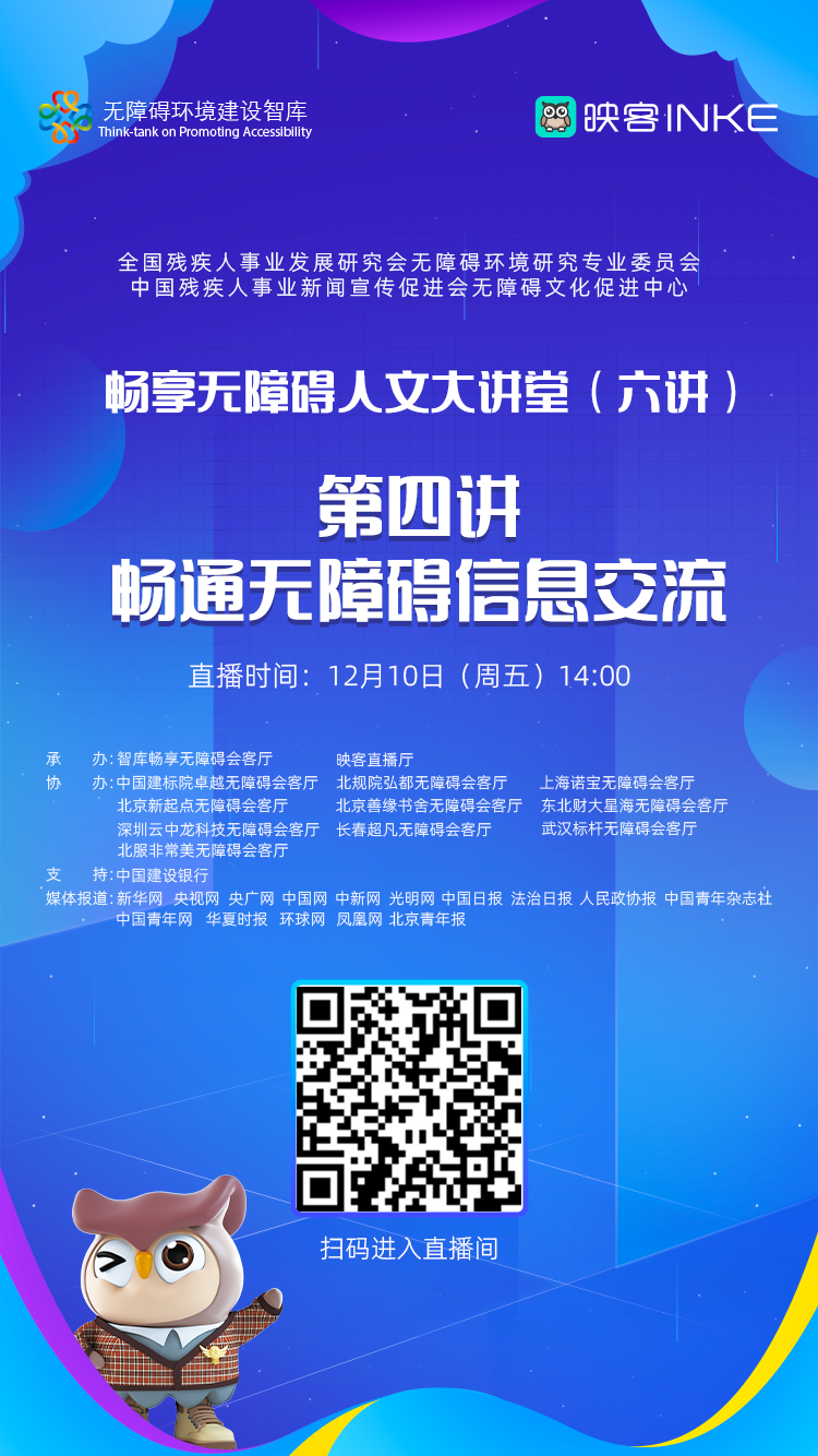 12月10日,畅享无障碍人文大讲堂第四讲“畅通无障碍信息交流”如期在北京映客直播间开讲。6位信息无障碍专家从需求和研究不同侧面分享我国信息无障碍发展及最新研究成果,为大讲堂带来科技助残、信息化赋能的新理念、新研究、新成果和新展望,丰富了人们对信息无障碍的认识,彰显我国信息无障碍发展为所有人提供的平等参与的权益保障。中国盲文图书馆信息无障碍中心主任何川担任大讲堂主持。此次活动映客直播共联合凤凰网、中国网、一点资讯、哔哩哔哩、知乎等 6家平台进行直播,据统计,目前各平台在线观看人数总计 189.9w次,各平台推荐位曝光总计 821w次,在线收视率再创新高。