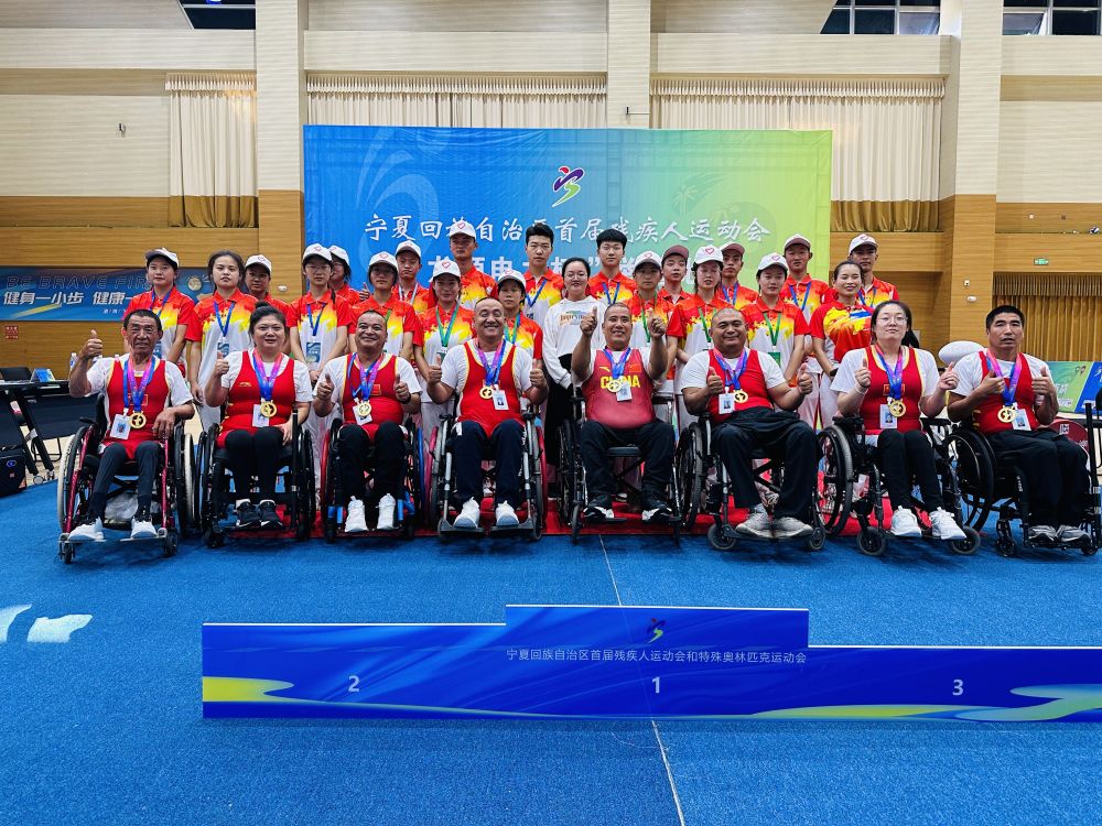 宁夏首届残特奥会举重比赛选手和志愿者合影。新华社记者马丽娟摄