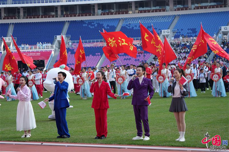 开赛仪式在3分钟精彩的开场表演中拉开帷幕。各代表队依次入场,阵阵掌声响彻全场。宣誓环节,运动员代表鲍锥耀、教练员代表黄晓明、裁判员代表杨杰林依次庄严宣誓。最后,全场齐唱2025残特奥会会歌《共赴山海》,为残特奥会田径项目写下最激荡的序章。本次活动紧扣“平等、融合、共享”的理念,通过简约而富有感染力的环节设计,生动展现残疾人运动员挑战极限、超越自我的精神风貌。仪式现场配备专业手语翻译,细节之处彰显人文关怀与城市温度。