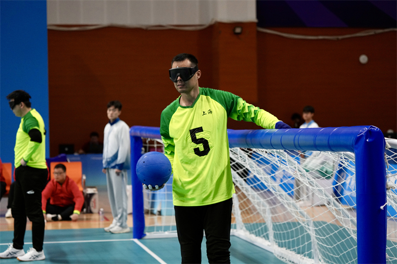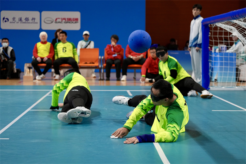 图:残特奥会盲人门球1-4名交叉赛中上海男队队员扑球防守