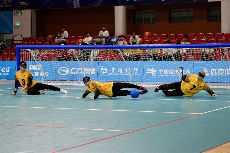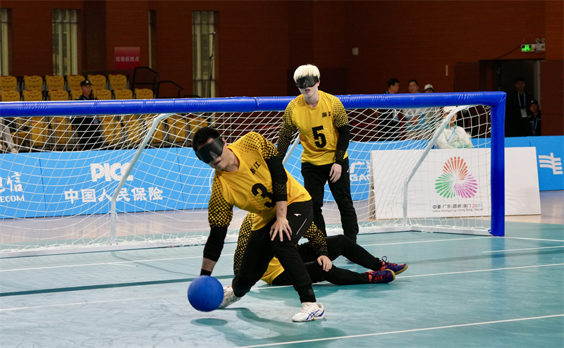 图:残特奥会盲人门球1-4名交叉赛中浙江男队队员扑球防守
