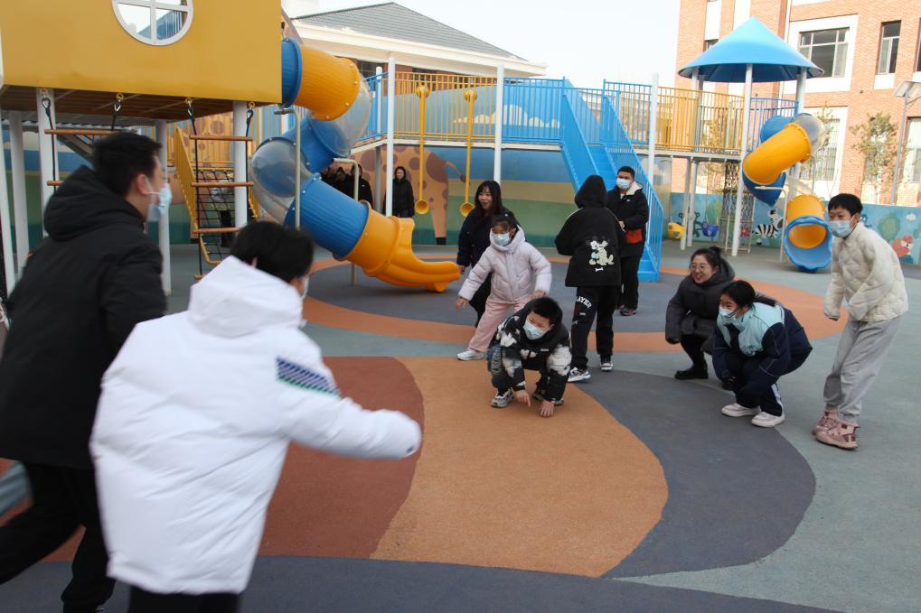 老师和孩子们一起在福利院内玩游戏。(刘俊平摄)