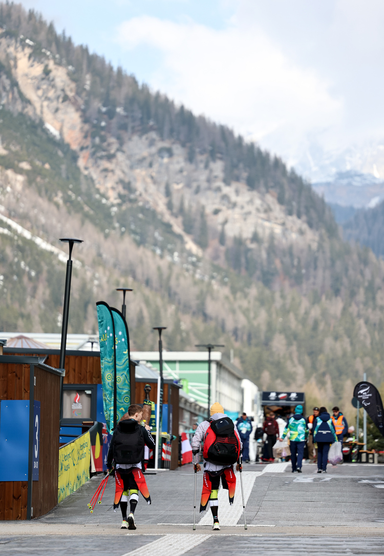 An athlete walks in the Paralympic Village of the Milan-Cortina 2026 Paralympic Winter Games in Cortina d'Ampezzo, Italy, March 3, 2026. (Xinhua/Wang Kaiyan)