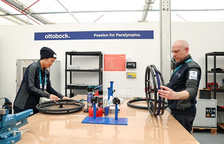 Staff members repair wheelchair in the repair service center at the Paralympic Village of the Milan-Cortina 2026 Paralympic Winter Games in Cortina d'Ampezzo, Italy, March 3, 2026. (Xinhua/Wang Kaiyan)