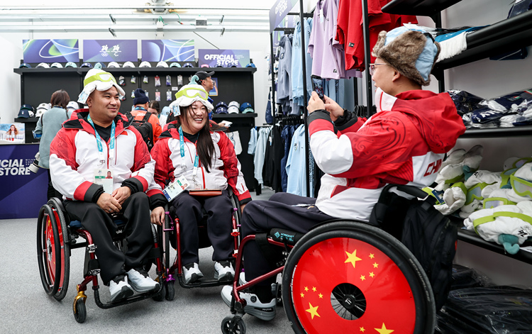 Chen Jianxin (R) of China takes photos for teammates Li Nana (C) and Wang Haitao in the official store at the Paralympic Village of the Milan-Cortina 2026 Paralympic Winter Games in Cortina d'Ampezzo, Italy, March 3, 2026. (Xinhua/Wang Kaiyan)