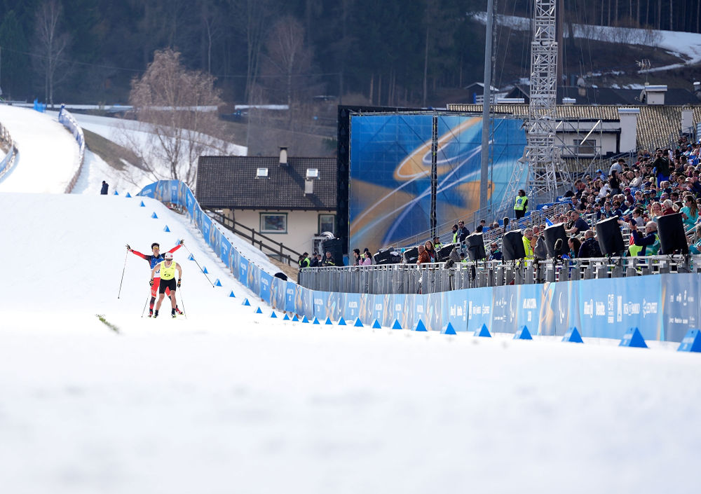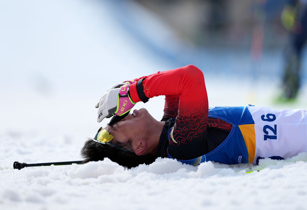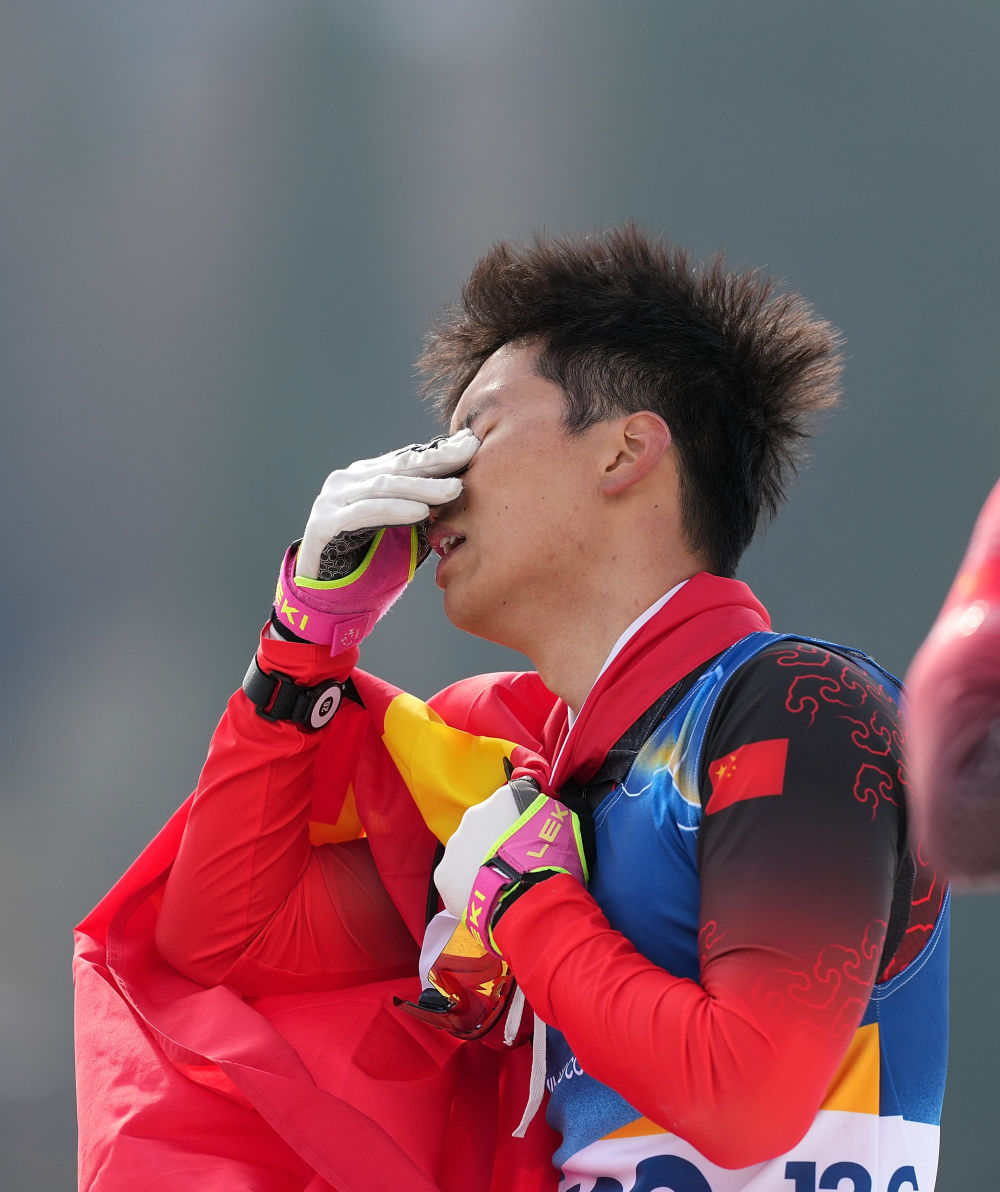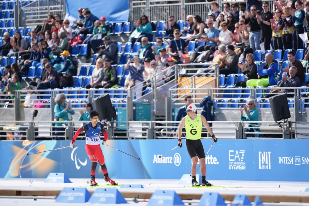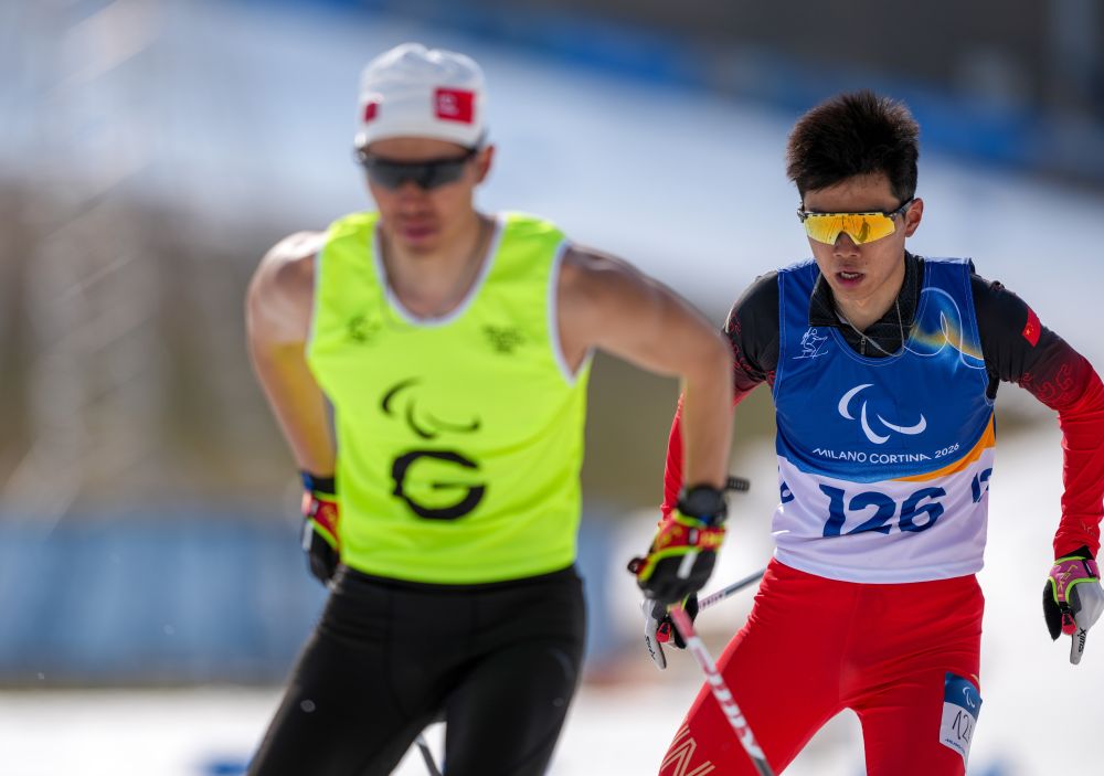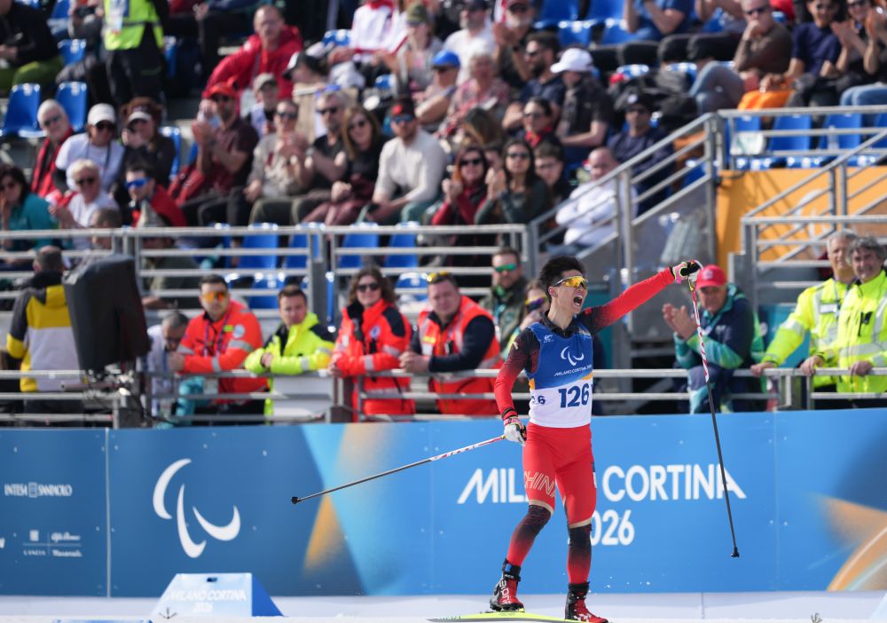 当地时间3月13日,在意大利泰塞罗举行的米兰-科尔蒂纳冬残奥会冬季两项男子短距离追逐(视障)比赛中,中国选手余爽夺得冠军。