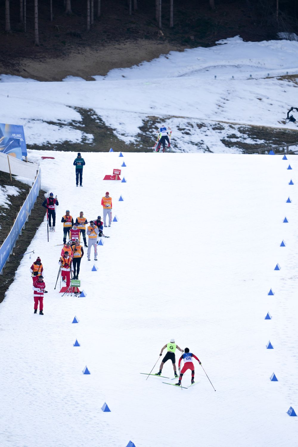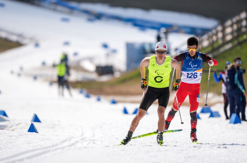 ↑中国选手余爽(右一)与引导员尚金财(右二)在比赛中。新华社记者连振摄