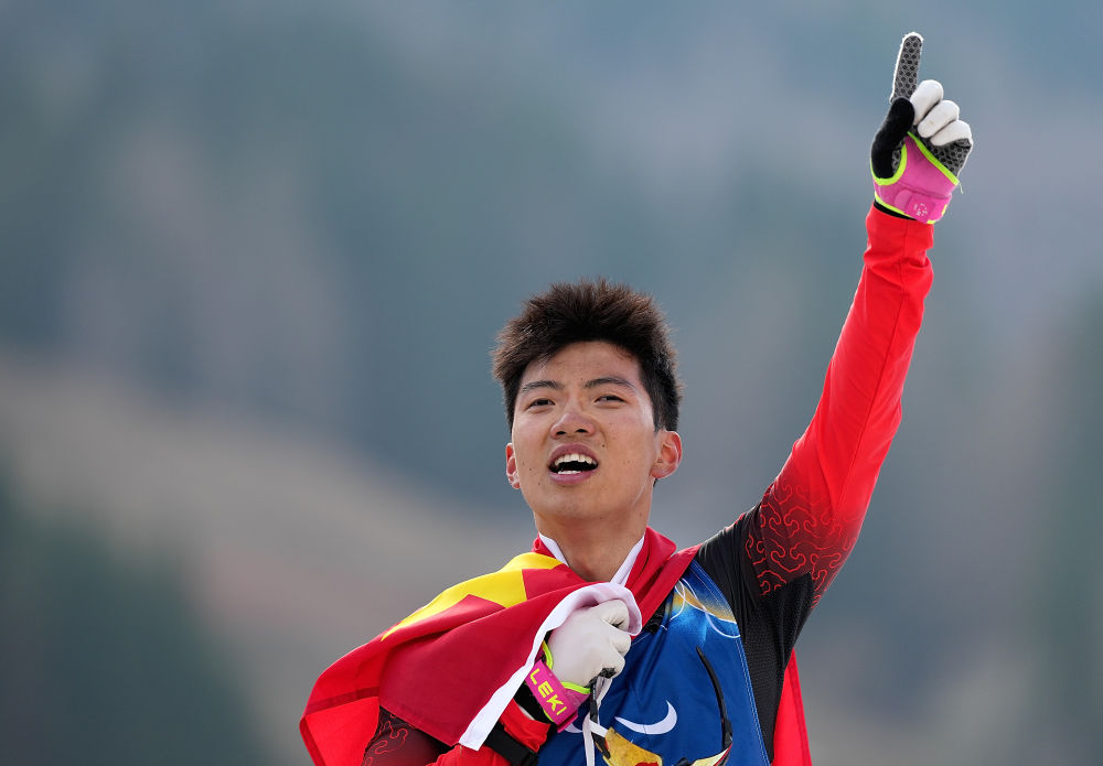 ↑中国选手余爽在冲过终点前庆祝。新华社记者连振摄