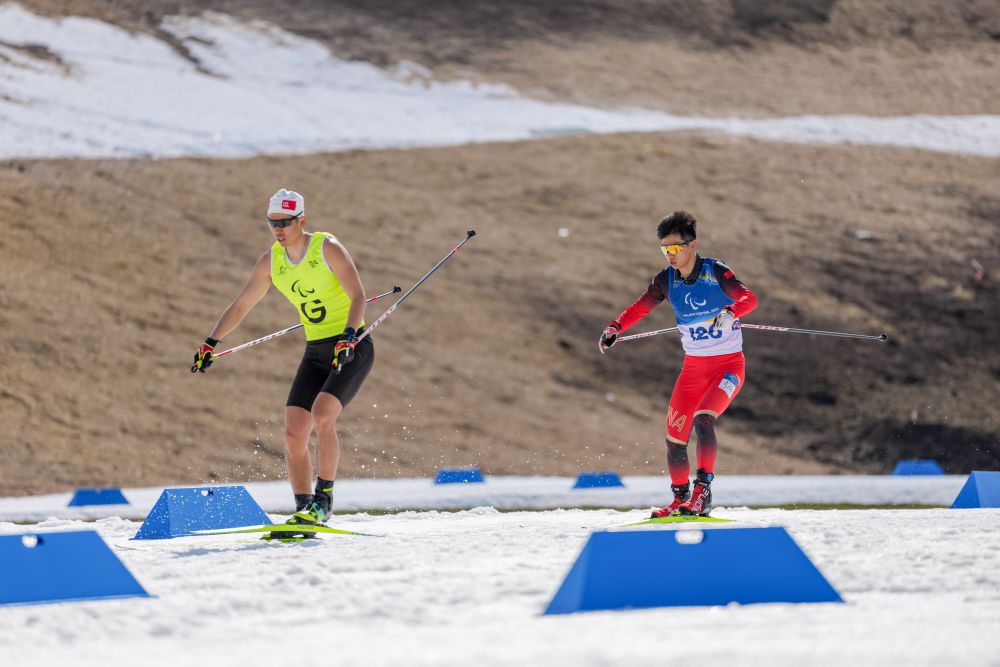 ↑中国选手余爽(左)与引导员尚金财在比赛中冲刺。新华社记者连振摄