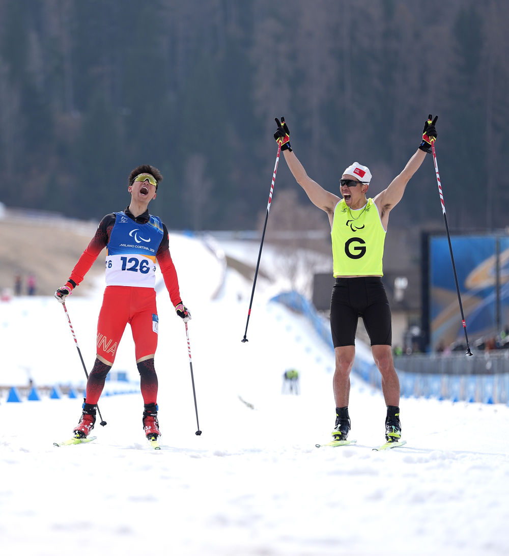 ↑中国选手余爽(左)与引导员尚金财在冲过终点线前庆祝。新华社记者侯昭康摄