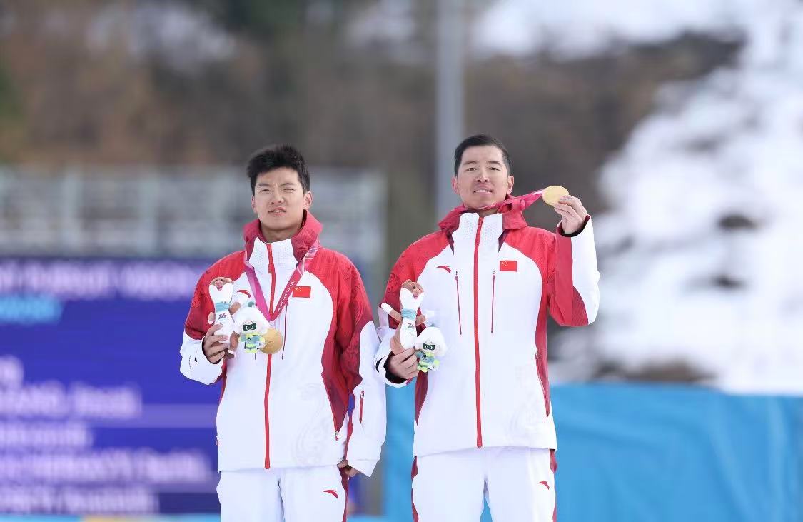 当地时间3月13日,米兰—科尔蒂纳冬残奥会冬季两项男子短距离追逐视障组比赛中,中国选手余爽(左)与领滑员尚金财夺得冠军。本报记者陶相安摄