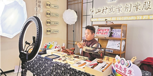 11月12日,在江苏省无锡市惠山区阳山镇桃文化残疾人之家,残疾人吴健正在直播售卖非遗桃木雕刻产品。据悉,阳山镇桃文化残疾人之家成立于2009年,为符合条件的残疾人提供技能培训、康复、文体活动、劳动就业等服务。